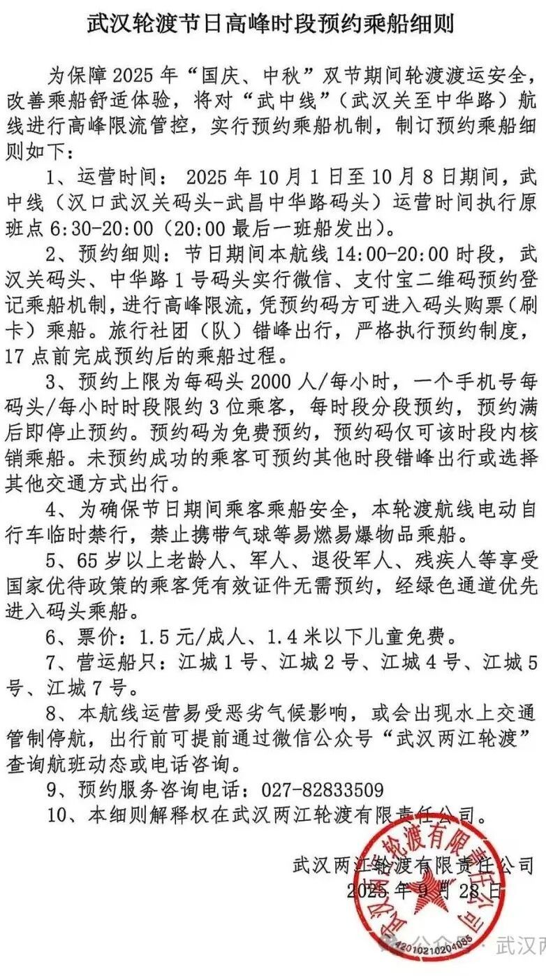 近日,武汉两江轮渡发公告称,为保障今年“国庆中秋双节”期间轮渡渡运安全,改善乘船舒适体验,将对“武中线”(武汉关至中华路)普客渡航线进行高峰限流管控和实行预约乘船机制。通告如下: