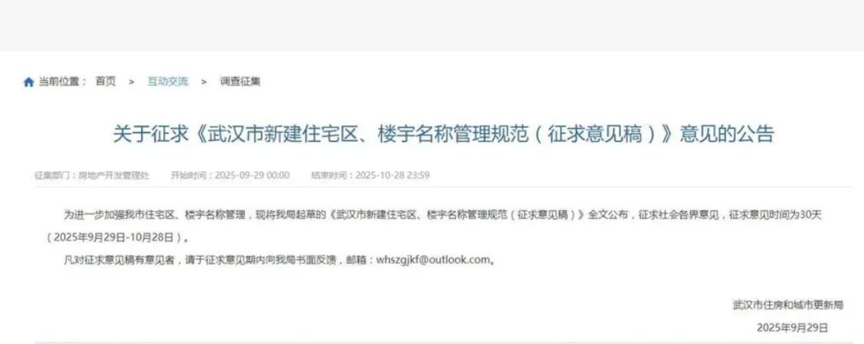 为进一步规范新建住宅区及楼宇命名管理,武汉市近日发布《武汉市新建住宅区、楼宇名称管理规范(征求意见稿)》,面向社会公开征求意见。该意见稿对楼盘命名提出了一系列明确要求,旨在规范武汉市新建住宅区、楼宇名称管理。