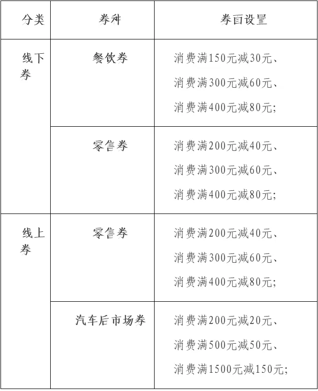 线上零售券:仅限于在电商平台自营商铺中粮油食品、服装鞋帽、报刊图书、母婴产品、美妆护肤、户外运动、医疗保健等商品(不含电子产品、家电、家具家装、电动自行车)。发放平台为京东、唯品会。