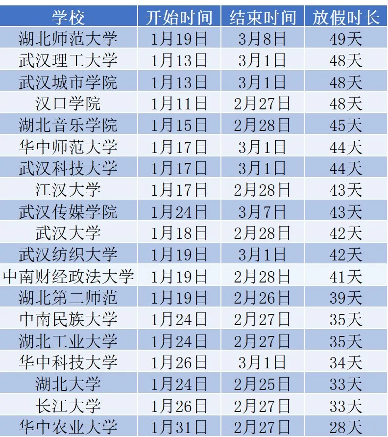 信息来源各高校校历(具体放假时间以学校通知安排为准)