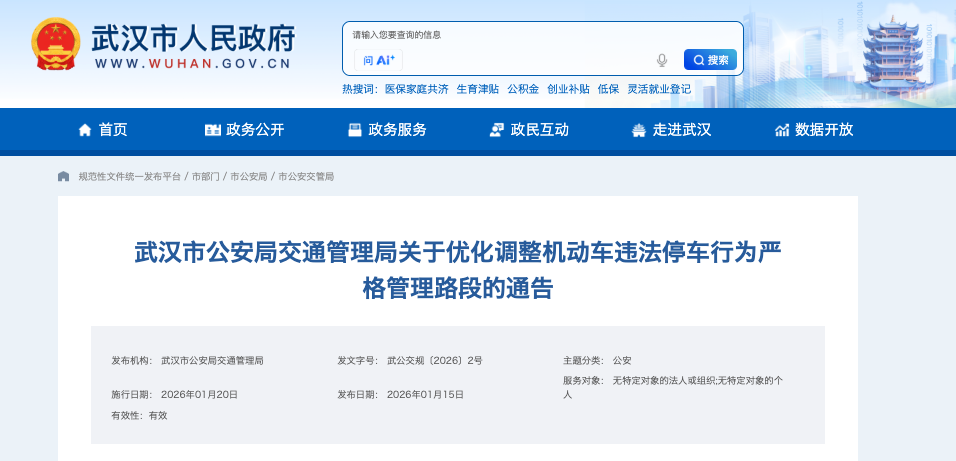 武汉市公安局交通管理局发布关于优化调整机动车违法停车行为严格管理路段的通告。