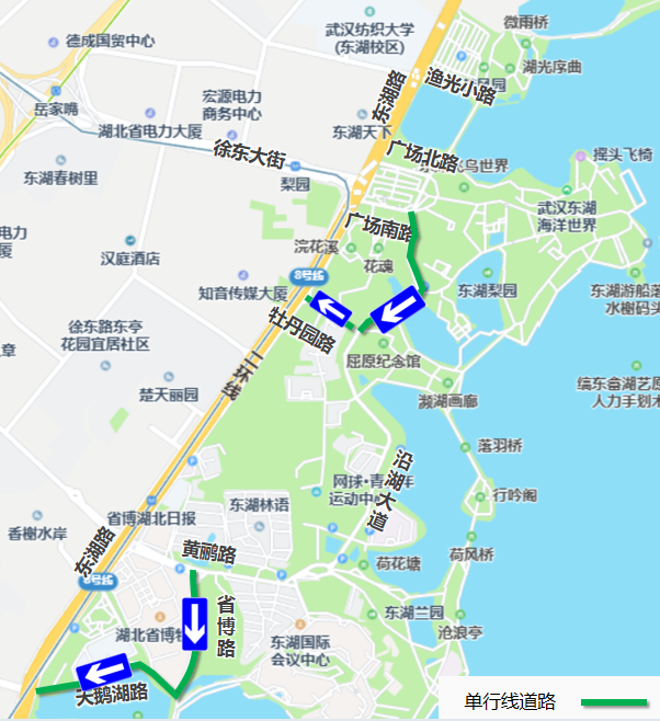 牡丹园路(沿湖大道至东湖路)只允许机动车由东向西(沿湖大道往东湖路方向)单向通行(沿线小区及单位车辆除外);
