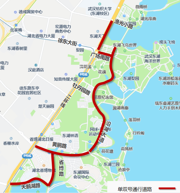 珞珈山路(八一路至珞狮路)、八一路南侧辅道(珞狮路至珞珈山路)禁止机动车通行和停放(公交车除外);
