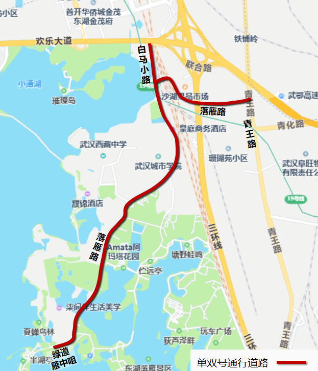 鲁磨路(八一路至樱花园大门)、植物园路(鲁磨路至团山路)、喻家湖路(喻家山北路至团山路)、团山路(喻家湖路至植物园路)、东湖南路(洪山路至卓刀泉北路)、卓刀泉北路(东湖南路至八一路)实行7座及以下载客汽车按车牌尾号分单双日通行,车牌尾号为字母的,按字母前最后一位阿拉伯数字对应日期的通行管理措施通行(巡游出租车除外)。
