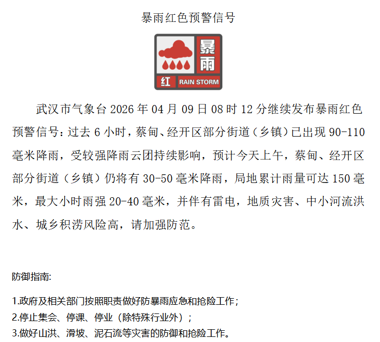 武汉市气象台2026年04月09日08时12分继续发布暴雨红色预警信号:过去6小时,蔡甸、经开区部分街道(乡镇)已出现90-110毫米降雨,受较强降雨云团持续影响,预计今天上午,蔡甸、经开区部分街道(乡镇)仍将有30-50毫米降雨,局地累计雨量可达150毫米,最大小时雨强20-40毫米,并伴有雷电,地质灾害、中小河流洪水、城乡积涝风险高,请加强防范。