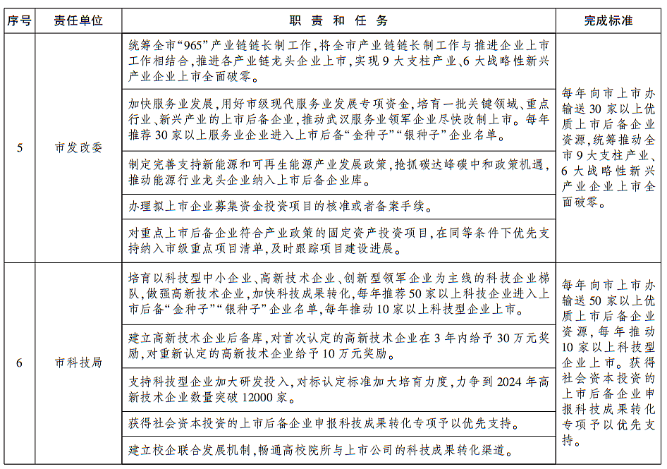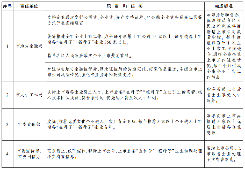 2.强化企业上市后备资源梯队建设。市企业上市工作领导小组办公室(以下简称市上市办)要制定上市后备企业库入库标准,每年动态调整发布上市后备“金种子”“银种子”企业名单,提供有针对性的政策支持。全市每年遴选上市后备“金种子”“银种子”企业350家以上。市、区招商部门要加大招商引资力度,引进一批优质的拟上市企业。争取湖北证监局进一步加大对我市企业上市工作的支持力度,指导保荐机构认真开展尽职调查和辅导,指导符合条件的企业做好申报准备工作。
