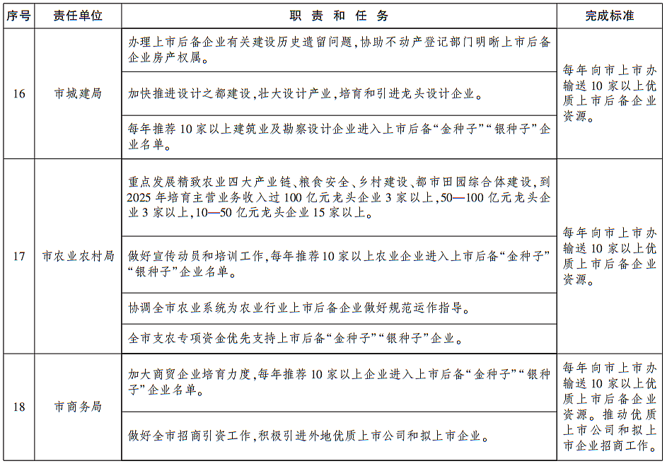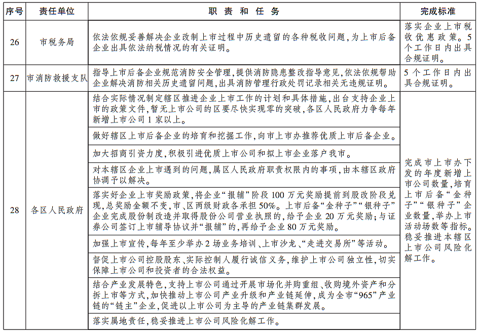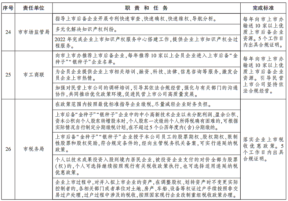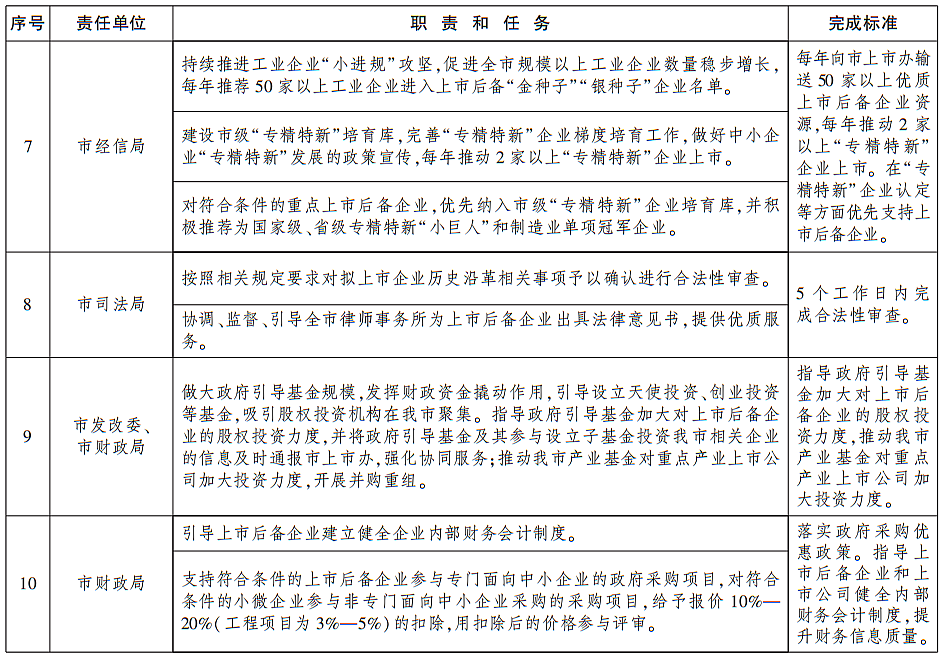 (二)落实工作责任。各区人民政府和市直相关部门要高度重视,把企业上市作为推动经济高质量发展的重要工作来抓。加快建立区人民政府负责人结对扶持上市后备企业制度。市发改委、市科技局、市经信局、市政府国资委等行业主管部门负责相关产业培育,支持相关行业企业做大做强。各级行政执法部门负责指导支持上市后备企业规范发展,帮助企业开具合规证明。