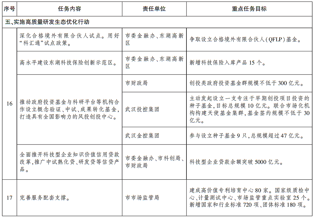 16.强化科技金融赋能。深化合格境外有限合伙人试点,拓宽科技型企业跨境融资渠道。用好“科汇通”试点政策,为符合条件的科研机构提供便利化跨境资金服务。高水平建设东湖科技保险创新示范区,引导保险机构为研发主体提供防范汇率波动、知识产权保护和网络数据安全等风险的综合保险方案。推动政府投资基金与科研平台等机构合作设立概念验证、中试、成果转化基金,打造具有全国影响力的风投创投中心。全面推开科技型企业知识价值信用贷款改革,推广中试熟化贷、研发贷等信贷产品。到2027年,创投类政府投资基金群规模不低于300亿元,科技型企业贷款余额突破5000亿元,新增科技保险入库产品15个。